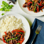 Add the beef back to the skillet along with the soy sauce, red curry paste, fish sauce, hoisin sauce, and sugar. Stir to coat the beef and veggies with the sauce.